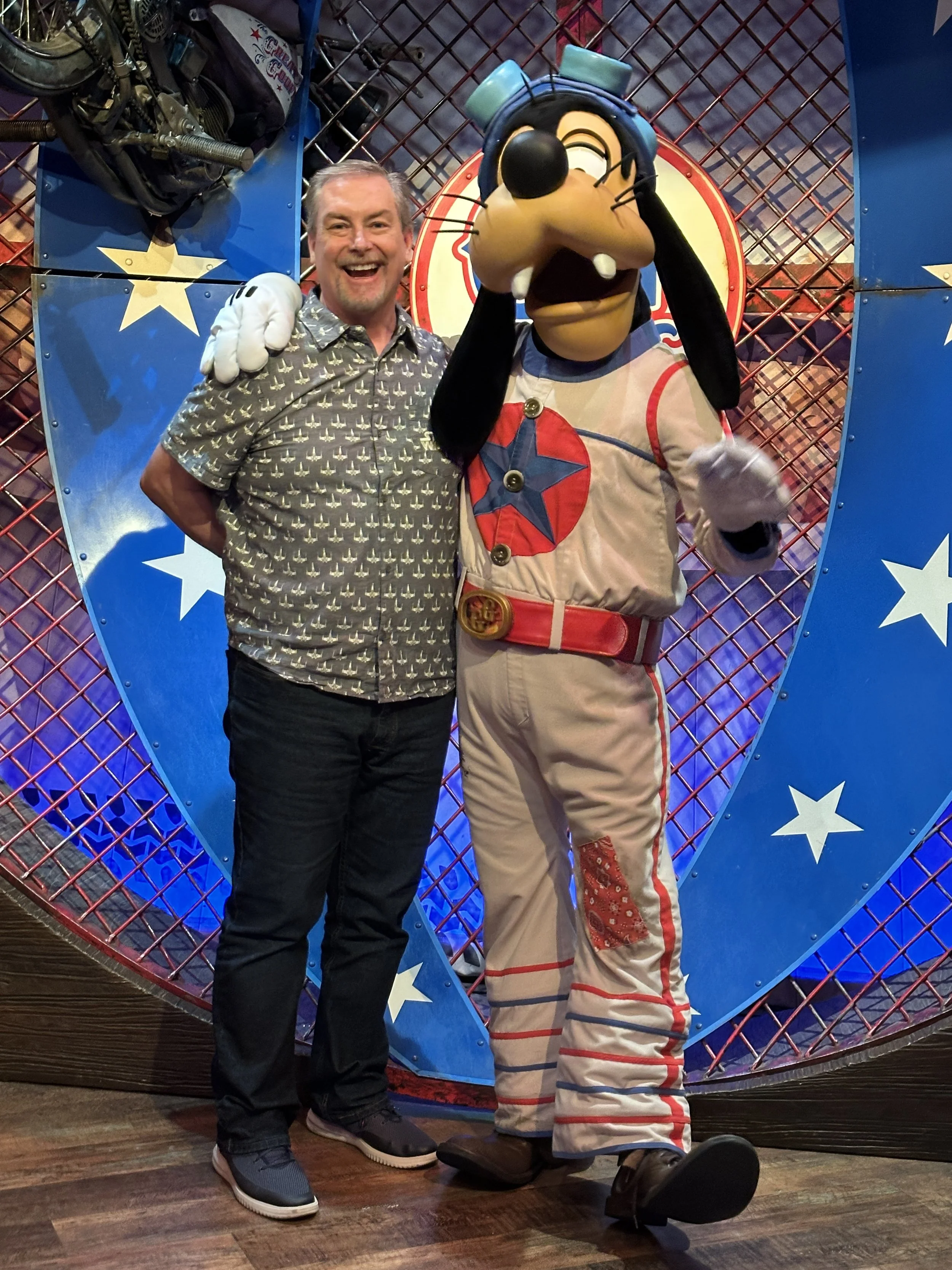 We rushed through the park headed to Pete’s for the encounter! We made it by mere seconds as we were the last guests allowed to join the line for the evening to see the Great Goofini! We congratulated each other on our achievement and as we celebrated, the Great Goofini joined in as if he had literally been waiting just to see us. We told Goofy we were thrilled to have him all to ourselves and, although exhausted from the rush to the tent, it was well worth the trek to see him! We then took pictures with our tall and goofy friend and created memories to last a lifetime!
